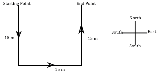 From the above figure we can see Vijayan is 15 m east from his starting point.