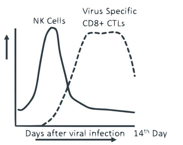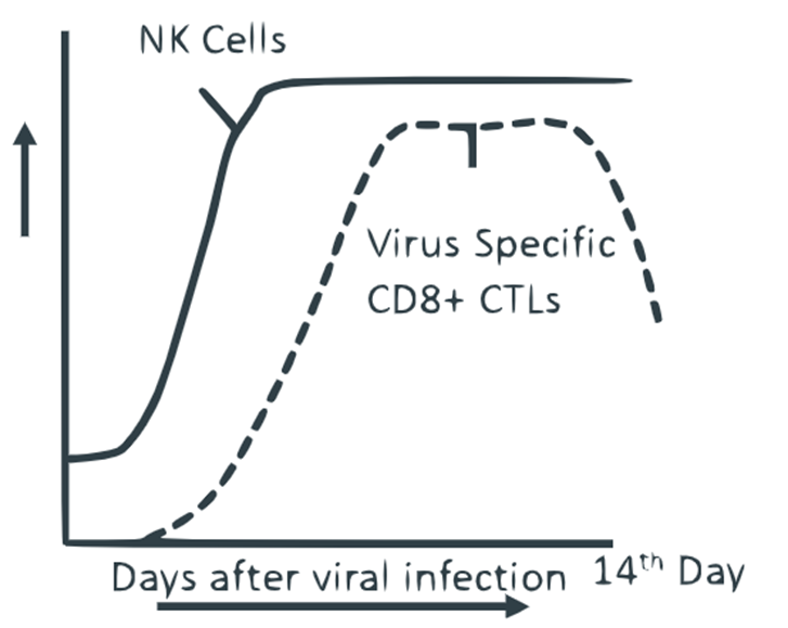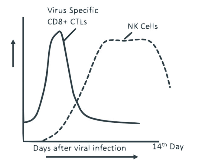 So, CD8⁺ CTLs rise later than NK, peak around day 10, and then decline.