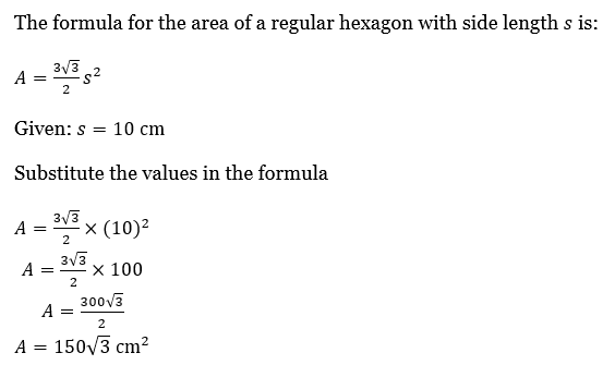 What is the area (in cm²) of a regular hexagon of side 10 cm?