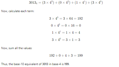 The digits of the base-4 number are multiplied by powers of 4 based on their position (starting from 0 on the right). For the number