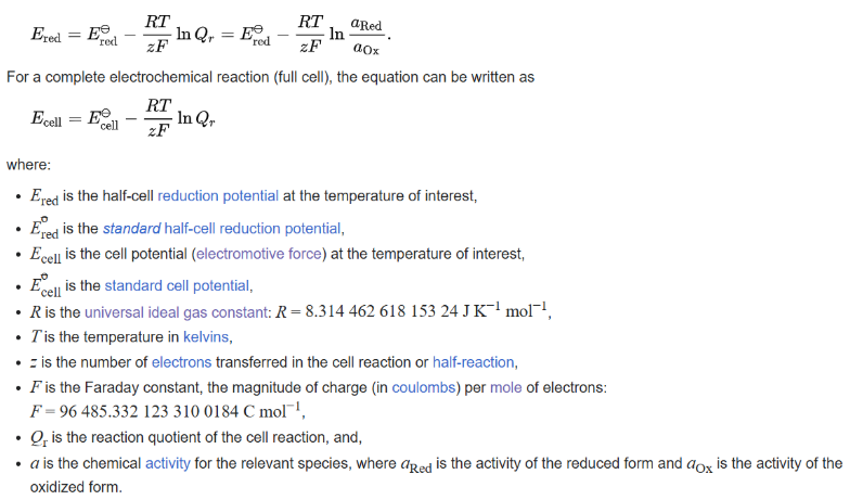The Nernst equation is a chemical thermodynamical relationship that permits the calculation of the reduction potential of a reaction (half-cell or full cell reaction) from the standard electrode potential, absolute temperature, the number of electrons involved in the redox reaction, and activities (often approximated by concentrations) of the chemical species undergoing reduction and oxidation respectively.