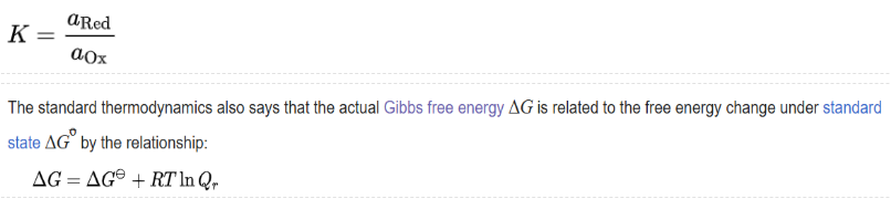 At chemical equilibrium, the ratio Qr of the activity of the reaction product (aRed) by the reagent activity (aOx) is equal to the equilibrium constant K of the half-reaction: