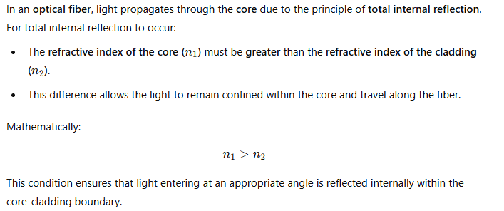 What is the relation between the refractive index of core n1 and cladding n2?