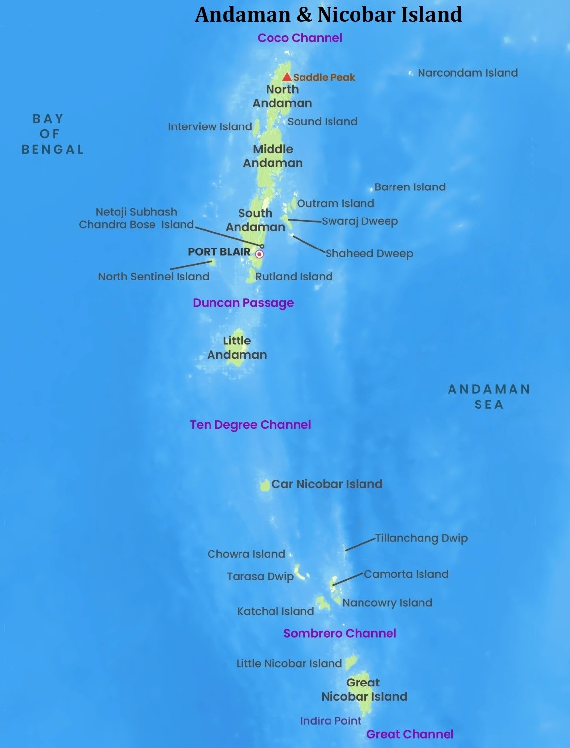 - Andaman Islands: Consisting of North Andaman, Middle Andaman, and South Andaman.