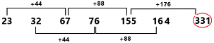 Logic: Adding (+44, +88 ...) and difference is twice each time.