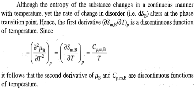 In a second order phase transition of a substance B, the chemical potential and its derivatives