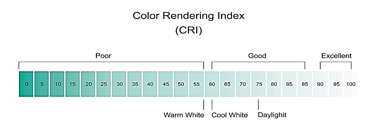 · Color rendering index (CRI) is measured as a number between 0-100.
