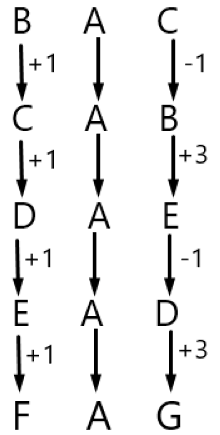 Logic: Each 1st letter increase by 1, each 2nd letter common and each 3rd letters difference (-1 and +3 sequence).