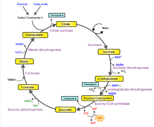 The cycle begins when Acetyl CoA (Acetyl Coenzyme A) combines with Oxaloacetate to form Citrate (Citric Acid), which then undergoes a series of reactions to generate ATP, NADH, and FADH₂.