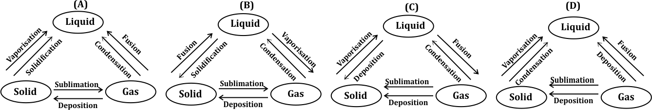 Option (B) accurately represents the interconversion of the three states of matter (solid, liquid, and gas) with all processes correctly labeled. This diagram is complete and accurate, showcasing all the necessary processes for transitioning between each state of matter.