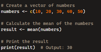 median (middle value) of a vector, not the mean. Example: median(c(10, 20, 30)) gives 20.