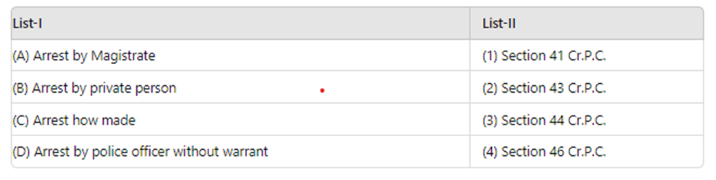 Section 45 is not correctly matched with "Arrest by Magistrate". Section 45 of the Criminal Procedure Code (CrPC) deals with the protection of members of the Armed Forces from arrest for anything done or purported to be done in the discharge of official duties, unless prior sanction is obtained from the Central Government. The correct section for "Arrest by Magistrate" is Section 44 of the CrPC.