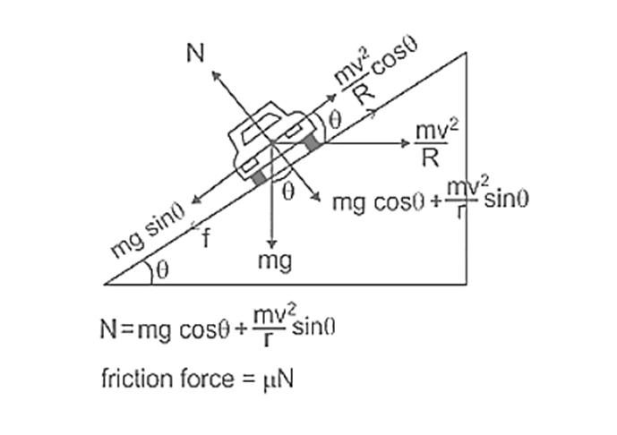 The general formula for the maximum permissible velocity vmax is:vmax=1−μstanθRg(μs+tanθ)Where:∙R is the radius of the curve,∙g is the acceleration due to gravity,∙μs is the coefficient of static friction between the tires and the road,∙θ is the banking angle of the road.If the coefficient of friction μs=0(i.e., the road is perfectly smooth), the maximum speed is:vmax=Rgtanθ