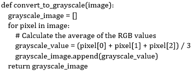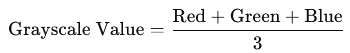 average the values of the red, green, and blue (RGB) channels for each pixel. The grayscale value for a pixel is calculated as: