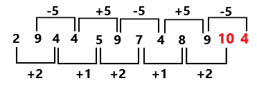 Given: 2, 9, 4, 4, 5, 9, 7, 4, 8, 9, ?