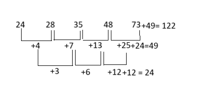 Which of the following numbers will replace the question mark (?) in the given series? 24, 28, 35, 48, 73, ?