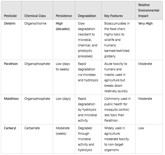 Parathion and Malathion: These organophosphates are more toxic to humans but degrade rapidly, reducing their environmental persistence.