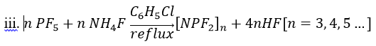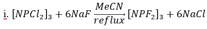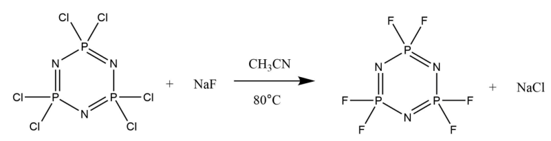 Hexafluorocyclotriphosphazene: Due to the chlorotrimer’s importance in past phosphazene reactions, finding a synthetic route that consistently produced hexafluorocyclotriphosphazene ([NPF2]3) at a high purity was extremely important. A number of pathways were reported in the literature with various fluorinating agents or catalysts. This procedure was selected as it involved only two reactants, [NPCl2]3 and NaF, meaning it would likely be the simplest way to get the high purity product that was desired.