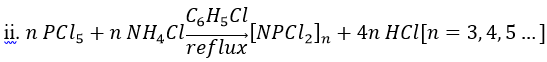 By replacing ammonia with ammonium chloride allows the reaction to proceed without a strong exothermic reaction associated with the NH3/PCl5. Typical chlorocarbon solvents are 1,1,2,2-tetrachloroethane or chlorobenzene, which tolerate the hydrogen chloride (HCl) side product. Since ammonium chloride is insoluble in chlorinated solvents, workup is facilitated. For the reaction under such conditions, the following stoichiometry applies: