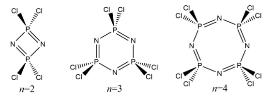 where n can usually take values of 2 (the dimer tetrachlorodiphosphazene), 3 (the trimer hexachlorotriphosphazene), and 4 (the tetramer octachlorotetraphosphazene).