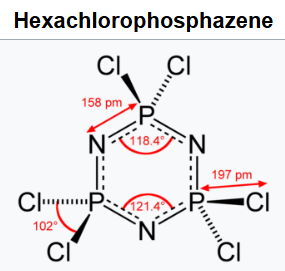 Hexachlorophosphazene is an inorganic compound with the chemical formula (NPCl2)3. The molecule has a cyclic, unsaturated backbone consisting of alternating phosphorus and nitrogen atoms, and can be viewed as a trimer of the hypothetical compound N≡PCl2 (phosphazyl dichloride). Its classification as a phosphazene highlights its relationship to benzene.