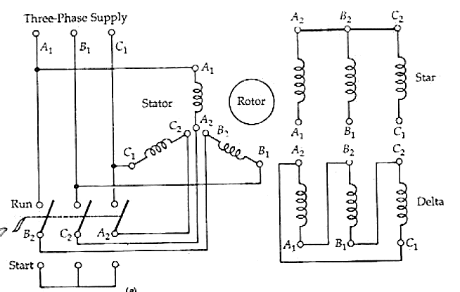 Delta starting:Ist(phase)=Z01V1Ist(phase)=Ist(line)=Z013V1Star connected startingIst(line)=Ist(phase)Ist(phase)=3Z01V1The ratio of currents of star connection and delta connection:Ist(delta)Ist(star)=Z013V13Z01V1=31The starting current with star starting is just 31 rd when compared to direct delta starting.