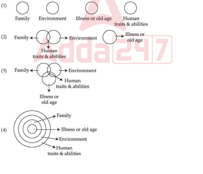 Human traits and abilities are influenced by multiple overlapping factors such as family background, environment, and conditions like illness or old age. These factors do not work independently; rather, they interact with each other and collectively shape human behaviour, skills, and capacities. The correct Venn diagram must therefore show interconnection and overlap among family, environment, and illness or old age, all contributing to human traits and abilities. Option (c) correctly represents this mutual interaction through overlapping circles.
