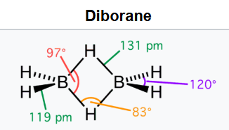 The structure of diborane has D2h symmetry. Four hydrides are terminal, while two bridge between the boron centers. The lengths of the B–H bridge bonds and the B–H terminal bonds are 1.33 and 1.19 Å respectively. This difference in bond lengths reflects the difference in their strengths, the B–H bridge bonds being relatively weaker. The weakness of the B–H bridge compared to B–H terminal bonds is indicated by their vibrational signatures in the infrared spectrum, being ≈2100 and 2500 cm-1 respectively.