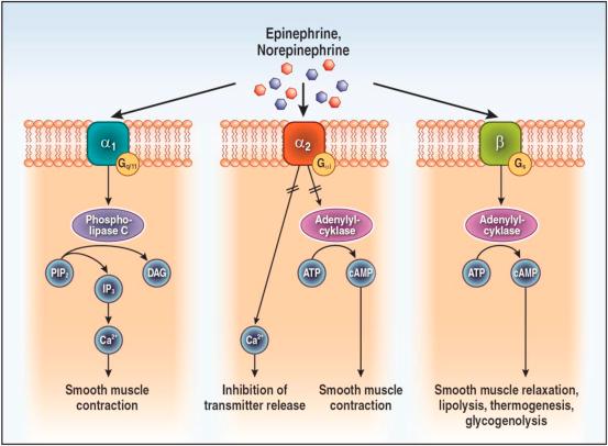 - (d) β₂: Incorrect —these are Gs protein-coupled receptors that increase cAMP levels upon activation by norepinephrine or epinephrine. Increases cAMP in smooth muscles to mediate vasodilation and bronchodilation