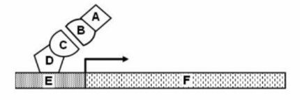 Gal4 binding domain (D) binds to the UAS element (E), a DNA sequence that drives the expression of the Reporter gene (F).