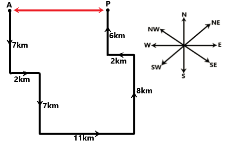Zakir starts from Point A and drives 7 km towards the South. He then takes a left turn, drives 2 km, turns right and drives 7 km. He then takes a left turn and drives 11 km. He then takes a left turn and drives 8 km. He then takes a left turn and drives 2 turns. He takes a final right turn, drives 6 km and stops at Point P. How far (shortest distance) and towards which direction should he drive in order to reach Point A again? (All turns are 90 degrees turns only unless specified.)