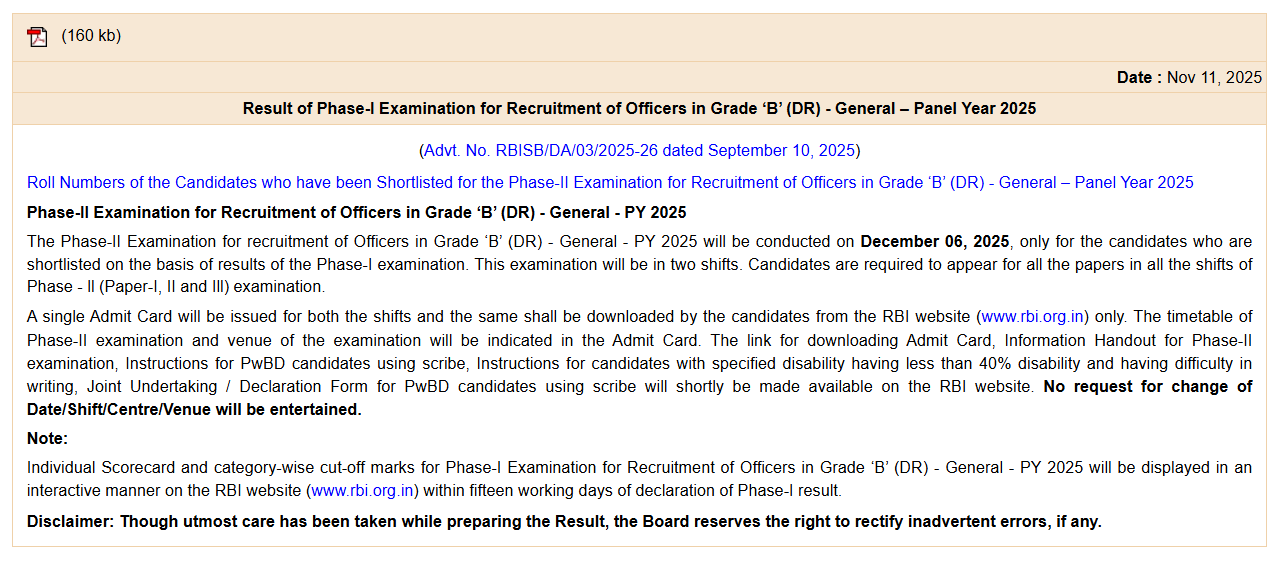 RBI Grade B Phase 1 Result 2025 Out, Direct Link to Download Result PDF