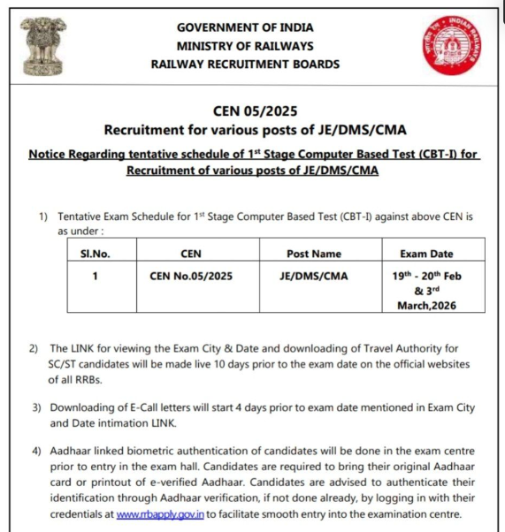 RRB JE CBT 1 Exam Date | 19th, 20th February and 3rd March 2026 |