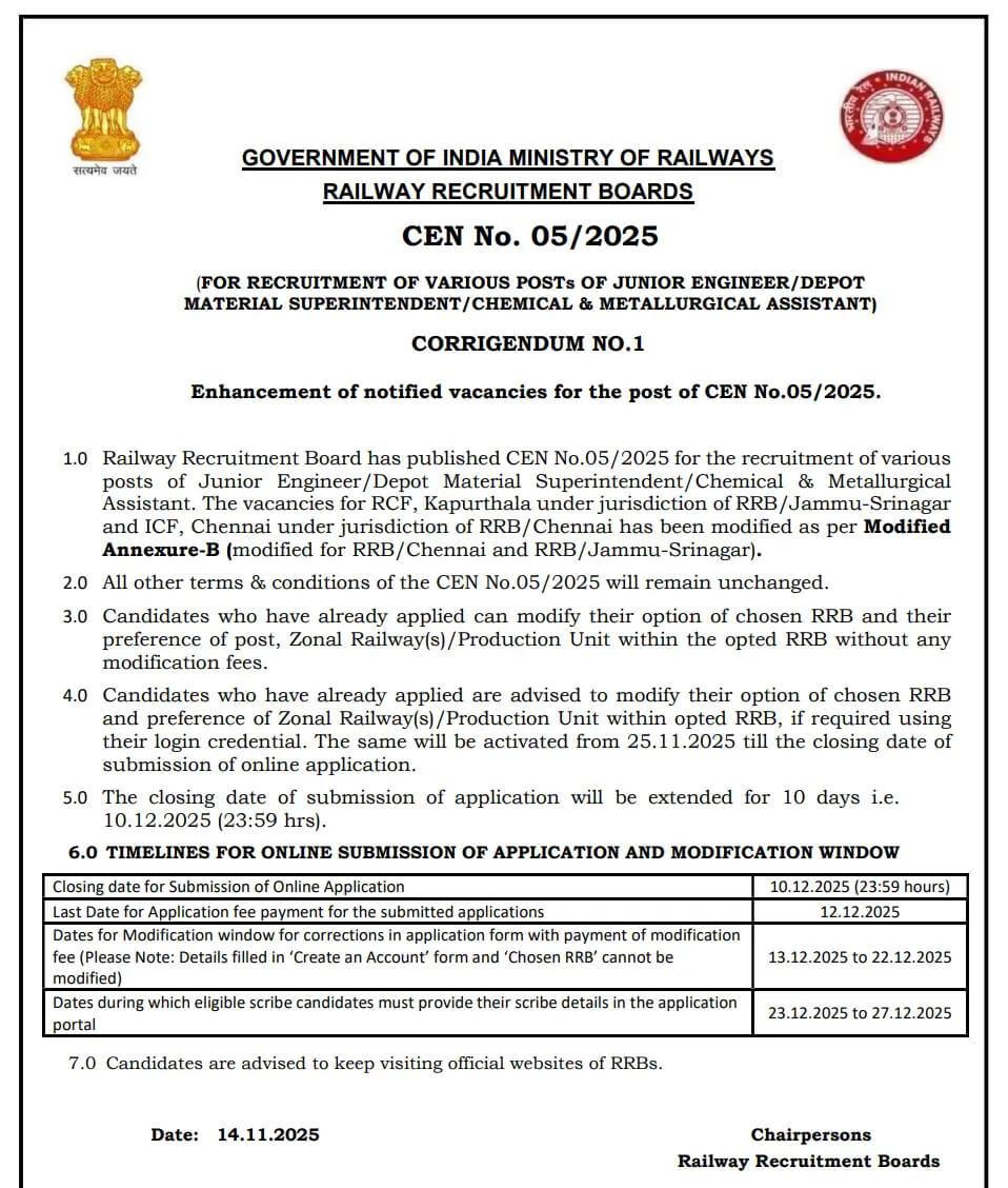 The last date to apply online for the RRB JE Exam is 10th December 2025 (11:59 PM). Check all important dates below.