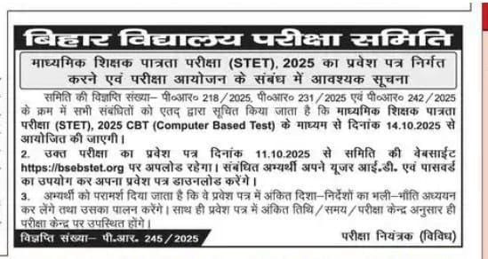 The Bihar School Examination Board (BSEB) has officially announced the release date of the Bihar STET Admit Card 2025. Candidates who registered for the Secondary Teacher Eligibility Test (STET) can download their hall tickets from 11 October 2025 onwards at bsebstet.org. The Bihar STET Exam 2025 will be conducted in Computer-Based Test (CBT) mode from 14 October to 31 October 2025 across various exam centres in the state.