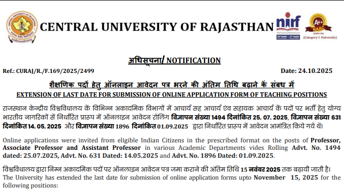 The Central University of Rajasthan (CU Rajasthan) has announced two separate faculty recruitment notifications for the year 2025, inviting applications for Professor, Associate Professor, and Assistant Professor positions in various academic departments under notification (Advt. No. CURAJ/R/F.167/Rectt./2025/1494, dated 25.07.2025) offers 18 vacancies. Candidates must carefully check the application dates for each recruitment drive and submit their forms accordingly. For detailed eligibility criteria, salary structure, and department-wise vacancies, visit the official website www.curaj.ac.in.