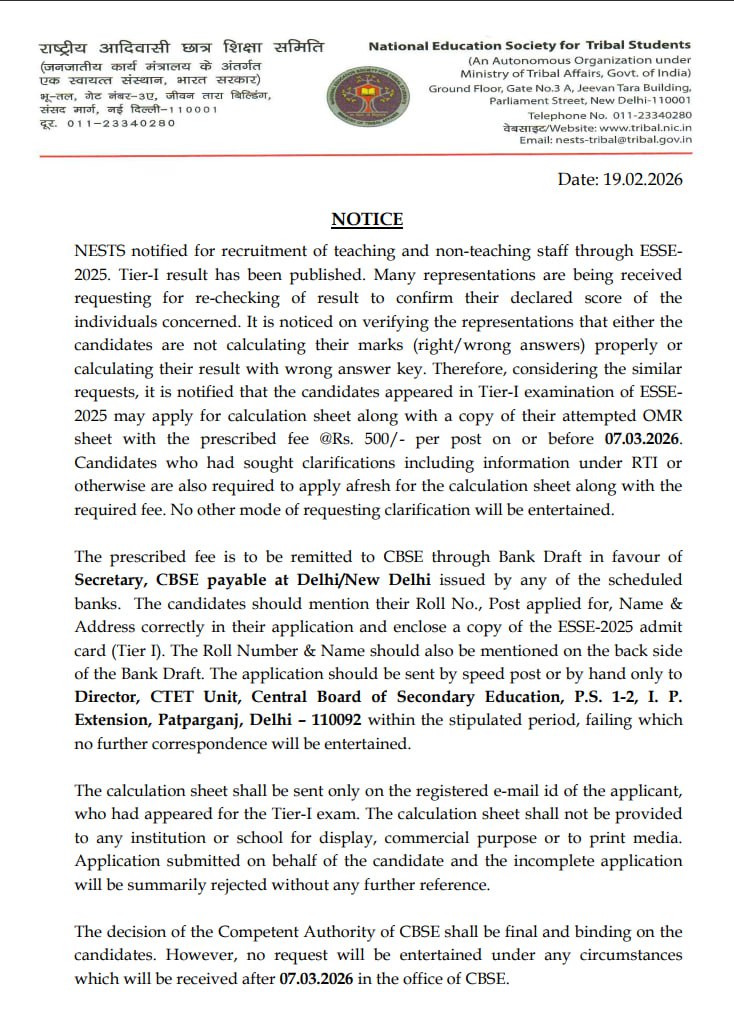 The EMRS Tier I Calculation Sheet is now available for access. Candidates who appeared for the EMRS ESSE 2025 Tier 1 exam now have clarity on how to get their scores verified. The National Education Society for Tribal Students (NESTS), under the Ministry of Tribal Affairs, Government of India, has officially issued a notice allowing candidates to apply for a calculation sheet of their Tier 1 result. This step addresses the growing number of representations related to score discrepancies and incorrect mark calculations.