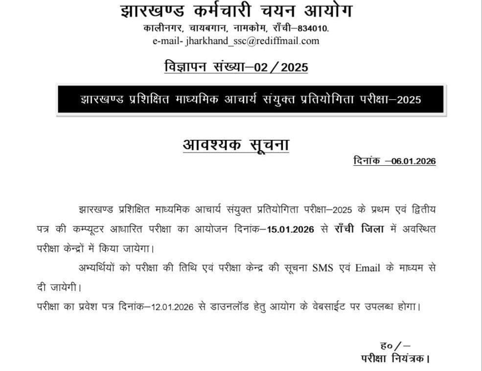 The announcement from Jharkhand Staff Selection Commission has about the JSSC Teacher Exam Date 2026 brings clarity and relief to thousands of aspirants. As per the latest notice, the Jharkhand Trained Secondary Teacher Combined Competitive Examination 2025 will be conducted in Computer-Based Test mode from 15 January 2026. The examination for both Paper I and Paper II will take place at designated exam centres in Ranchi district. Candidates will be informed about their exact exam date and centre through SMS and email, while the admit card will be available for download from 12 January 2026 on the official JSSC website. With the exam schedule now confirmed, aspirants should shift their focus to final revision and mock practice to make the most of the remaining time.