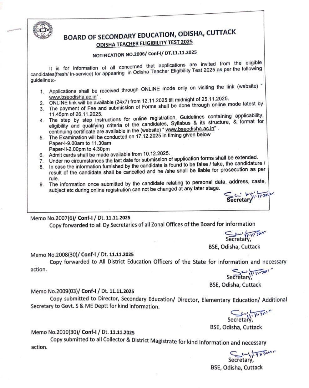 The OTET 2025 notification has been released under Notification No. 2006/Conf-I/DT.11.11.2025. Eligible candidates are invited to register online to appear for the examination. The OTET assesses the ability of candidates to teach effectively at primary (classes I-V) and upper primary (classes VI-VIII) levels. The exam is scheduled for 17th December 2025:
