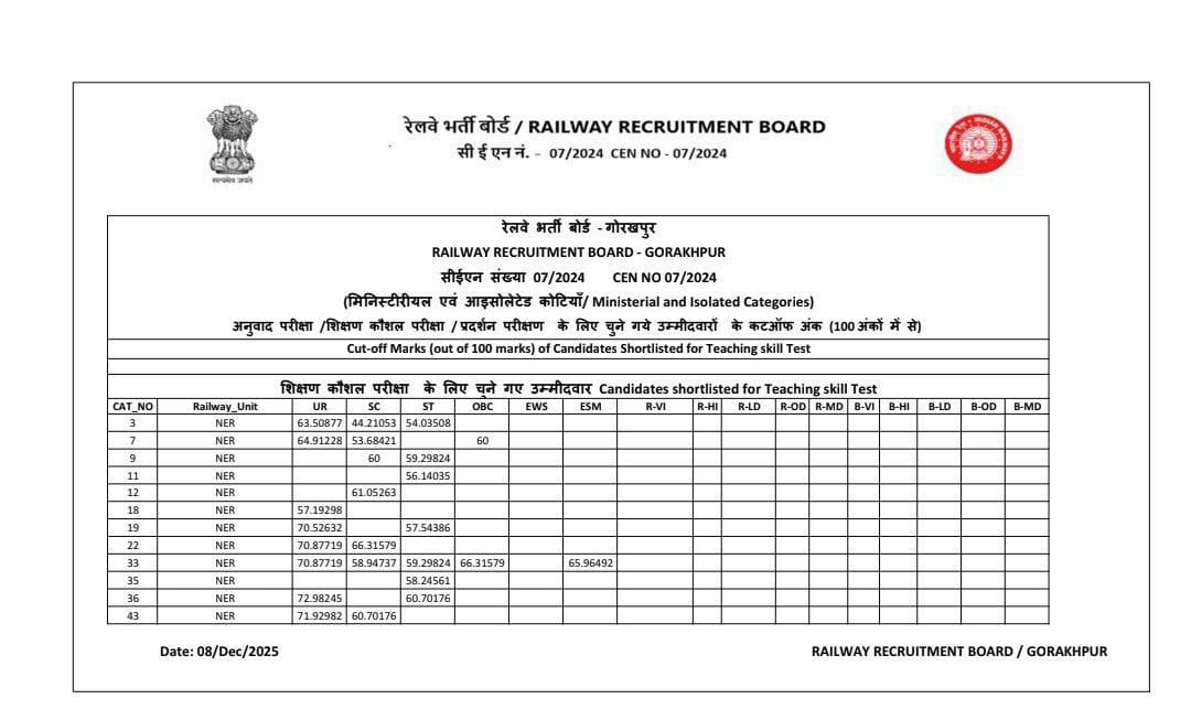 | RRB Gorakhpur Cut Off 2025 | Download PDF |