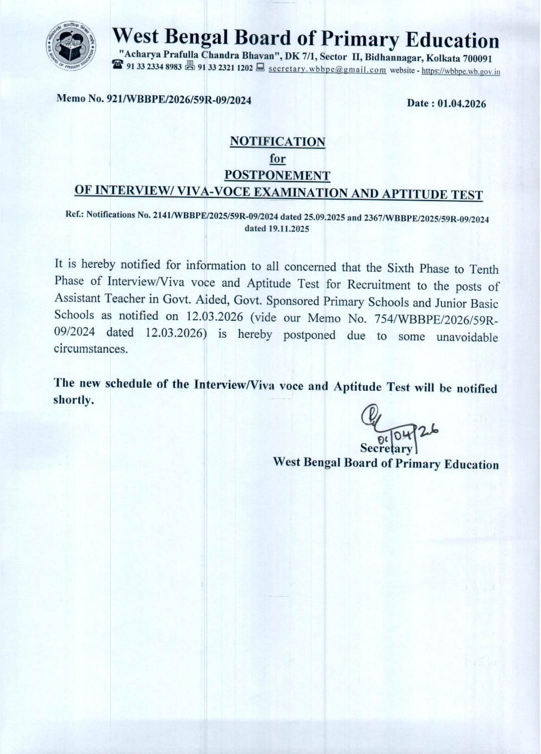 As per the official notification released on 1 April 2026 (Memo No. 921/WBBPE/2026/59R-09/2024), the West Bengal Board of Primary Education has postponed the Sixth to Tenth Phase of the Interview/Viva Voce and Aptitude Test. The notice clearly states that the postponement is due to “some unavoidable circumstances.” No further details have been shared about the exact reason behind this decision. The new interview schedule will be shared shortly by the WBBPE.