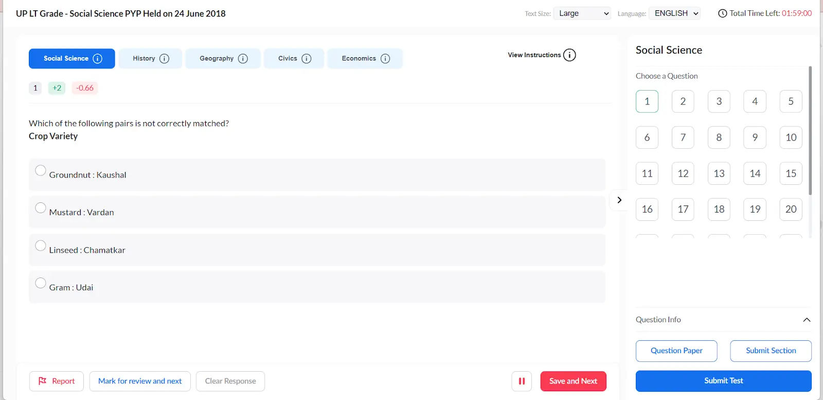 Practice online UP LT Grade Social Science Mock Test Series in English and Hindi. Access to full-length, topic-wise, and chapter-wise tests designed as per the latest syllabus and pattern. Our test improves your accuracy, speed, and conceptual clarity with regular practice and detailed performance insights. Start your preparation today with the free UP LT Grade Social Science Mock Test and boost your chances of scoring high.